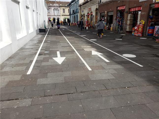 Sinalização para distanciamento social durante a pandemia de Covid-19 Foto: Prefeitura de Cuenca