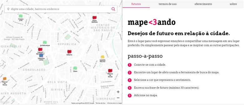 Pelo site mapeandofuturos.com.br as pessoas acessam um colorido mapa virtual, digitam o endereço de um ponto de afeto da cidade e escrevem uma mensagem ao local. "Uma frase para reinventarmos o amanhã coletivamente", afirma outro cofundador do CalçadaSP, o também publicitário Tony Nyenhuis. "Com tantas notícias negativas no presente, achamos ser importante projetarmos mensagens positivas para um novo amanhã", diz Tony. "Mapear desejos através dos pontos de afeto das pessoas com os lugares. Virar um pouco a chavinha do hoje para o futuro.”