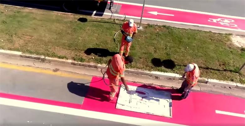 | Equipe da prefeitura aplica a sinalização na ciclofaixa Imagem: Pref. S.Parnaíba |