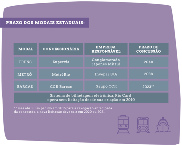 Na Região Metropolitana do Rio, os modelos do sistema de ônibus são variáveis. Há municípios que operam por concessão, mas também há outros em que não há regras de permissão definida e por fim, existe o caso de Tanguá, que segundo o Mapa da Desigualdade, não possui linha de ônibus municipais. A capital carioca recebeu a sua primeira licitação pública de linhas de ônibus em 2010, mas o desdobramento desse processo não foi positivo. Os resultados foram: os constantes entraves no prazo para as empresas de ônibus modernizarem as suas frotas, uma investigação do sobre o esquema de fraude nas licitações e a CPI dos ônibus na Câmara Municipal.