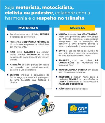 Atento aos registros de acidente envolvendo e vitimando ciclistas, e à necessidade do respeito às prioridades nas vias, além do respeito às ciclofaixas, o Governo do Distrito Federal (GDF), por meio do Departamento de Trânsito (Detran-DF), está em fase de produção de uma campanha de educação no trânsito para estimular o cuidado com quem conduz as bikes (saiba mais na ilustração abaixo). Com isso, o órgão quer valorizar a bicicleta e também estimular o uso de um transporte não poluente em Brasília.