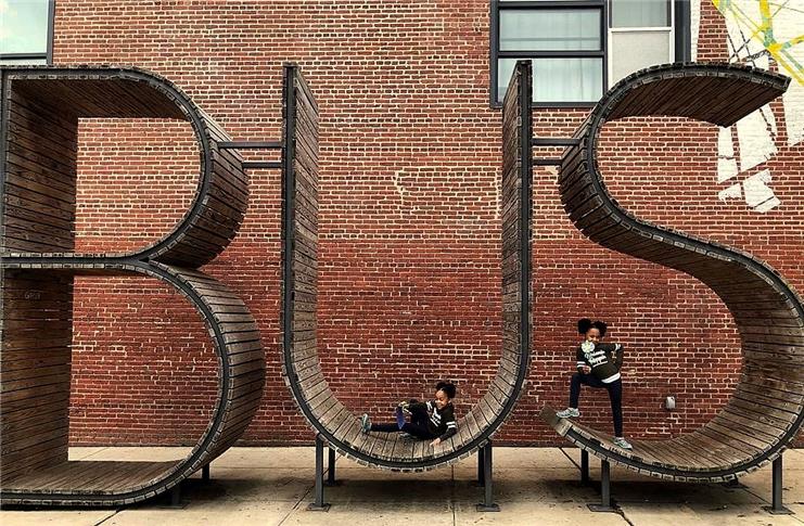 Instalada em julho de 2014 na cidade de Baltimore, Maryland (EUA), a gigantesca escultura do coletivo espanhol Mmmm é também o ponto de ônibus em frente ao centro cultural e museu Creative Aliance.