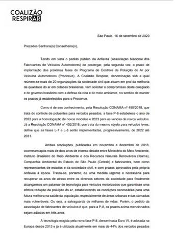 Em resposta a esse pedido público das montadoras, a rede Coalizão Respirar, que congrega mais de 20 organizações, encaminhou ao ministro do Meio Ambiente Ricardo Salles e aos 49 conselheiros do Conselho Nacional do Meio Ambiente (Conama) uma carta pública que reivindica a manutenção dos prazos do programa que exige a transição tecnológica da indústria automobilística com o objetivo de reduzir a poluição veicular.