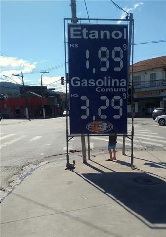 A placa do posto, colocada em local errado, cria um ponto cego para motorista e pedestres,