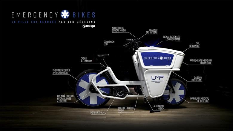Desenvolvidas pela Ecox em parceria com a agência Wunderman Thompson Paris, as novas cargo-bikes azuis e brancas foram disponibilizadas em parceria com a Urgence Médicales de Paris (UMP).