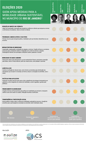 A mobilidade ativa (pedestres e ciclistas) consta dos programas, com maior ou menor detalhamento. O atual prefeito Crivella, por exemplo, promete implantar cerca de 30% do plano diretor cicloviário em até quatro anos. O candidato do Republicanos, e também Martha Rocha e Benedita da Silva, prometem ampliar as ciclofaixas e a rede de bicicletas compartilhadas.
