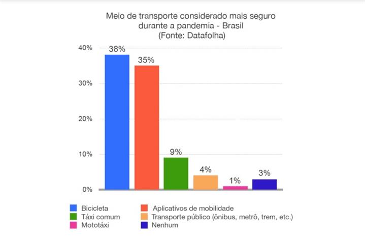 Dessa parcela de brasileiros sem veículo próprio, 38% acreditam que a bicicleta é o meio mais seguro para se locomover. A bike empata tecnicamente (pela margem de erro) com aplicativos do tipo Uber, que vem logo em seguida, com 35% da preferência. Em terceiro lugar está o táxi, com 9% das respostas, seguido do transporte público, que atinge 4% de preferência na opinião dos entrevistados.