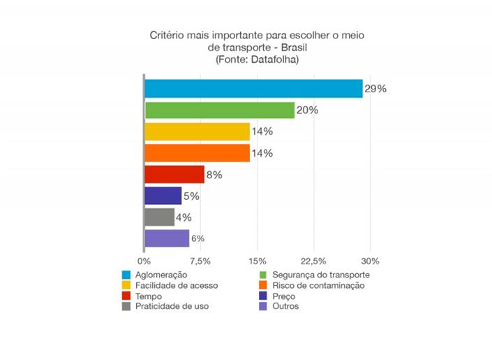 O Datafolha também perguntou os motivos para a escolha do modal de transporte durante a pandemia. Para os brasileiros, os critérios mais importantes para escolher o meio de transporte são o grau de aglomeração (29%), a segurança que o transporte oferece (20%) e, empatados com 14%, a facilidade de acesso ao meio e o risco de contaminação.