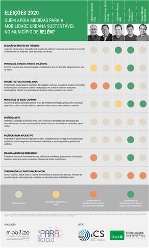 Apenas o programa de governo do Thiago Araújo, candidato que conta com o apoio da atual gestão, pauta de forma mais evidente a mobilidade sustentável, destacando a mobilidade por bicicleta, mobilidade a pé e redução de velocidade na cidade, principalmente no que se refere ao centro comercial da Região Metropolitana de Belém, assim como o estímulo aos deslocamentos ativos na mobilidade entre bairros da cidade, além de citar sobre a grande entrada de mercadorias por via fluvial no centro da cidade. O programa também afirma que haverá ampliação do sistema de bicicletas e patinetes compartilhadas, serviços que foram retirados da cidade após a gestão atual encerrar o contrato com a empresa responsável, colocando Belém na contramão da tendência mundial.