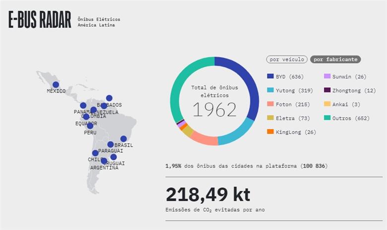 Segundo dados do E-Bus Radar (www.ebusradar.org), a América Latina conta atualmente com 1962 ônibus elétricos, o que corresponde a cerca de 2% do total de ônibus em circulação nos países da região. A maior parte dos novos veículos a bateria foi adquirida pela cidade de Santiago, no Chile, mas também há trólebus e ônibus híbridos (diesel e elétrico) em circulação em praticamente todos os países latino-americanos, incluindo capitais e cidades médias.