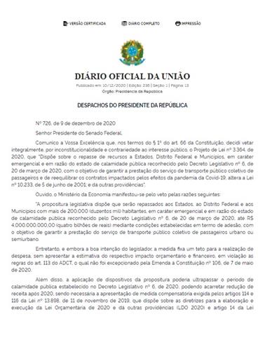 O Diário Oficial da União divulgou hoje (10) a Mensagem 726/2020 da Presidência da República que veta integralmente, por inconstitucionalidade e contrariedade ao interesse público, o Projeto de Lei nº 3.364, de 2020, que previa uma ajuda de R$ 4 bilhões a estados, ao Distrito Federal e aos municípios com mais de duzentos mil habitantes, em caráter emergencial e "em razão do estado de calamidade pública, para atender e garantir a continuidade dos serviços de transporte público".