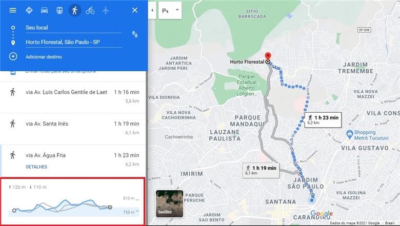 Exemplo de rota pedestre do Google Maps, com a indicação, distância, tempo e altimetria do trajeto