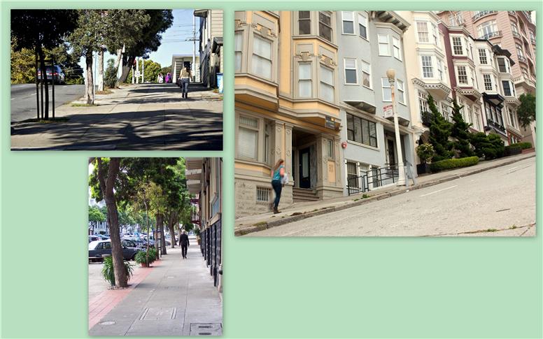 Acredite, há lugares onde isso é possível. Veja o exemplo de São Francisco nos Estados Unidos, cidade que ficou famosa por seus filmes de perseguição e ação em suas ladeiras e morros. Lá a maior parte das calçadas em ladeiras são regulares, largas e lindas para caminhar.