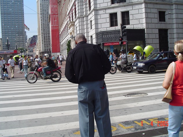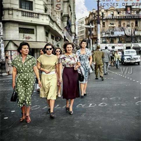 Mas ela não era assim conforme comprova a foto de 1947. O local de travessia era delimitado por pequenas taxas metálicas redondas perfiladas em linhas paralelas. Pode ser que na época nem houvesse manuais e normas de sinalização para especificar como se deve sinalizar uma travessia.