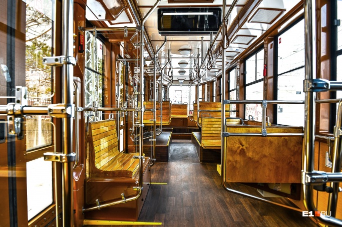Interior dos novos bondes: bancos e piso de madeira Imagem: Railway Gazette