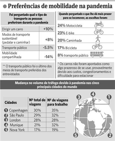 Os números já confirmam o temor alimentado desde 2020 por quem vive a mobilidade urbana. E o fenômeno é mundial. Relatório 2021 "Mobility Futures", resultado de 9.500 entrevistas feitas em fevereiro de 2021 com moradores de 13 cidades em todo o mundo - São Paulo entre elas -, constatou que mais pessoas estão usando carros no lugar do transporte público por preocupações com a pandemia. Em grandes cidades como Nova York, Chicago, Pequim, Mumbai e Paris, o transporte público foi o último dos meios de transporte preferidos dos entrevistados. Imagine esse cenário no Brasil? O levantamento foi feito por uma empresa de pesquisas de consumo e divulgado pelo Fórum Econômico Mundial (World Economic Forum).