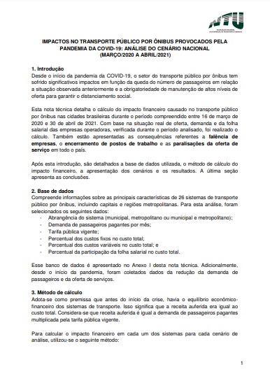 A Associação Nacional de Empresas de Transportes Urbanos (NTU) divulgou hoje um relatório em que apresenta os problemas gerados pela pandemia aos sistemas de transportes coletivos nas cidades brasileiras, sem que tenha sido adotada qualquer ajuda emergencial federal para o conjunto das empresas. O monitoramento traz dados sobre o impacto da pandemia no período de 16 março de 2020 a 30 de abril de 2021. Destacam-se a interrupção da prestação dos serviços de 25 operadoras e um consórcio operacional e demissões de 76.757 trabalhadores. Observa-se também a insatisfação da população com a redução ou interrupção da oferta de transporte público.