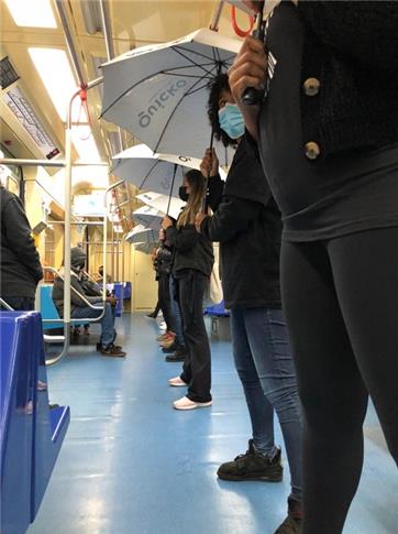 Passageiros do metrô de São Paulo foram pegos de surpresa na manhã desta quarta-feira (28) quando, sem aviso prévio, um grupo de pessoas foi abrindo seus oito guarda-chuvas, lado a lado, dentro dos vagões e na plataforma da estação República da linha vermelha.