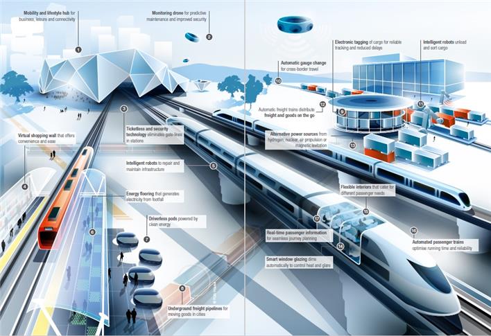 O relatório prevê a manutenção preventiva das linhas ferroviárias por drones autônomos, trens sem condutor viajando com segurança em alta velocidade, cargas enviadas automaticamente ao seu destino e uma tecnologia inteligente projetada para melhorar a experiência do passageiro e permitir viagens sem bilhetes (algo próximo do último ponto já é aplicado em alguns países da Europa).