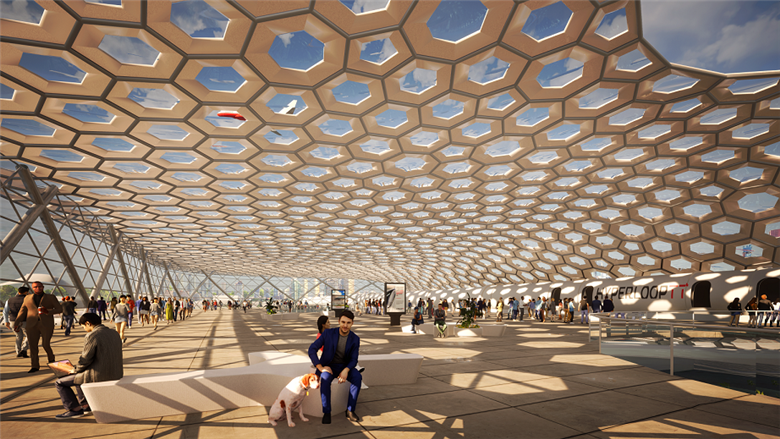 Projeção artística de estação do hyperloop previsto para o Sul do Brasil. Imagem: Divulgação