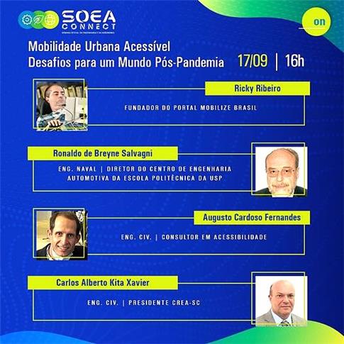 A palestra vai abordar o tema "Mobilidade Urbana Acessível - Desafios para um Mundo Pós-Pandemia" e integra a extensa programação da Soea, que neste ano será realizada de maneira remota, com transmissão on-line (sala 6 virtual).