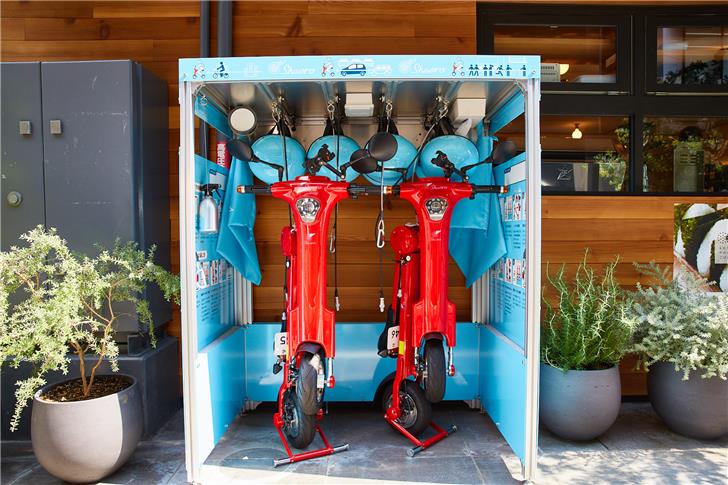 Os pequenos ciclomotores funcionam de maneira similar aos patinetes elétricos, com a diferença que o usuário vai sentado. Para guardar o veículo, basta dobrar, pendurar o veículo dentro do “armário estação” e plugá-lo no carregador.