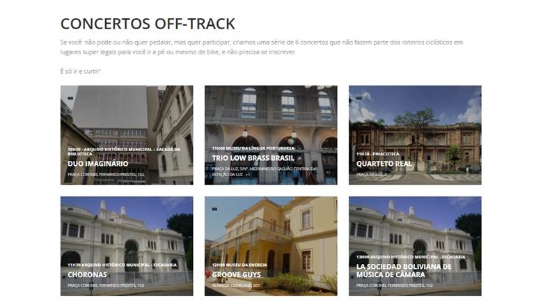 Já para quem quiser ir a pé, de transporte público ou de carro, também há opções, dizem os organizadores: serão realizados seis concertos off-track, que não fazem parte dos roteiros de bike e não precisam de inscrição prévia.