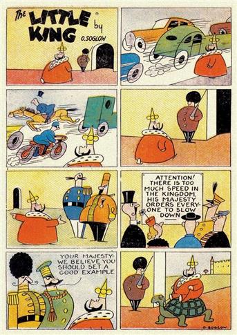 Nesta tira, dos anos 1940, o tema era o excesso de velocidade nas ruas de seu reino. A solução é curiosa, mas revela que o problema já estava bem presente no dia a dia das pessoas, pelo menos em Nova York. E o tema dos abusos nos veículos motorizados aparece em várias histórias do pequeno e bem humorado soberano.