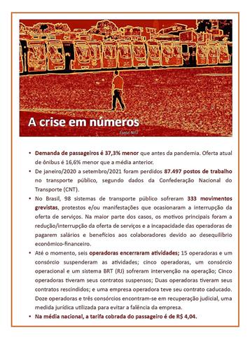 De janeiro de 2020 a setembro de 2021 houve perda de 87.497 postos de trabalho no segmento de transporte público de passageiros e o registro de 333 movimentos grevistas, protestos e/ou manifestações que ocasionaram a interrupção da oferta de serviços em 98 sistemas de transporte público por ônibus em todo o país, quadro que vai se agravar no próximo ano se não forem tomadas as devidas providências pelo poder público.