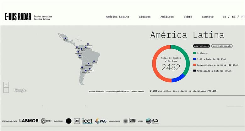 Página inicial do site E-Bus Radar: sistema acompanha a evolução da frota elétrica de ônibus