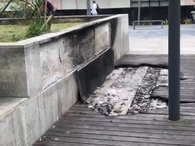 Para piorar a situação, ainda colocaram fogo num deck de madeira da Orla. Foto: Francini Augusto