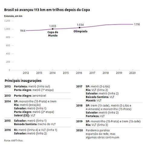 O Rio de Janeiro foi outra, com expansões e a construção da linha 4, que liga a zona sul à Barra da Tijuca, além de três linhas de VLT. Mesmo assim, os jogos deixaram canteiros inteiros de obras paradas. "A prioridade é terminar, senão para voltar é preciso mobilizar tudo de novo e fica muito mais caro", diz Joubert Flores, da ANPTrilhos.