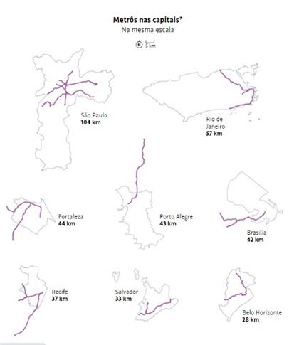 "Mas, se você for olhar o momento atual, o único lugar com crescimento definido é São Paulo mesmo", diz Flores. Na maioria das capitais, o metrô ainda é uma realidade distante, como em Manaus e Curitiba, para ficar nas que abrigam mais de 1 milhão de habitantes.