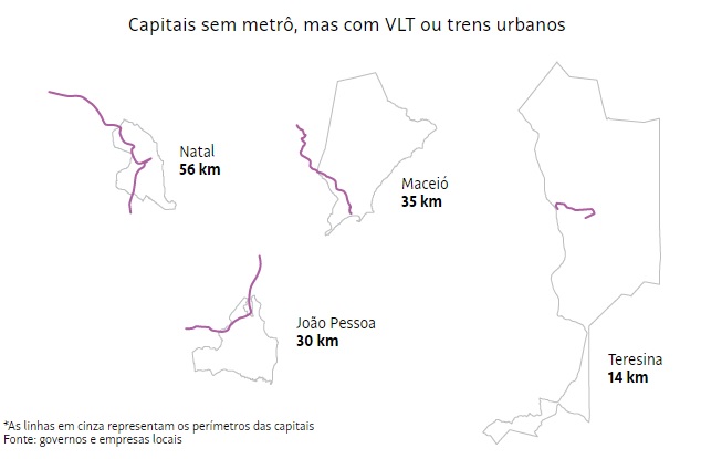 Teresina é outra que depende de um pequeno sistema de VLT, de 14 km, mas não tem data prevista para pôr em prática projetos de modernização e expansão para outras regiões, que ainda estão em fase de conclusão.