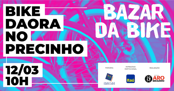 Neste sábado (12), o Instituto Aromeiazero, em parceria com o Shopping Campo Limpo, localizado na zona sul de São Paulo, promovem o Bazar da Bike. A ação acontece das 10h às 18h, ou enquanto durar o estoque de bicicletas, avisa a organização social, cujo objetivo é utilizar a bicicleta para reduzir desigualdades sociais.