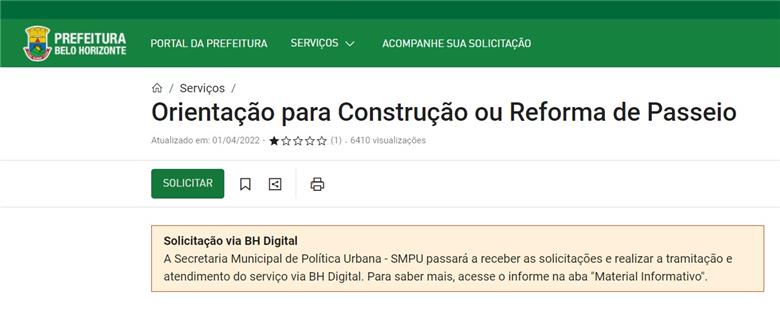 Para orientar moradores e proprietários de imóveis, a partir deste mês de abril, a prefeitura da capital mineira abriu um canal de comunicação on-line que receberá dúvidas sobre a construção ou reformas das calçadas. O atendimento será feito diretamente pela Secretaria Municipal de Política Urbana, por meio do BH Digital, uma plataforma agregada ao Portal de Serviços da PBH. Antes, o interessado precisava agendar o serviço previamente na Central de Relacionamento Presencial BH Resolve.