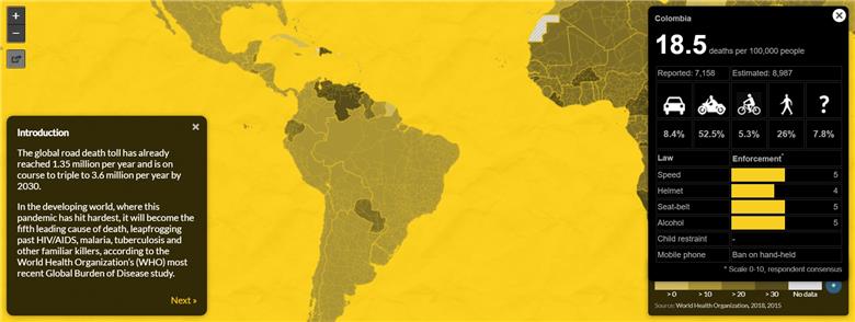 Um exemplo é a Colômbia, onde uma viagem de 300 km leva cerca de sete horas, enquanto na Espanha essa mesma distância seria percorrida em cerca de três horas, escreveu a jornalista Diana López Zuleta, em um artigo publicado no jornal El País. O exemplo reflete a realidade, porque muitas estradas colombianas passam pelas duas cordilheiras que cruzam o país e têm pistas com dois sentidos de tráfego, que praticamente impedem ultrapassagens seguras. Assim, no mapa do FMI a Colômbia aparece com a cor vermelha, indicativa de velocidades entre 30 km/h e 60 km/h, enquanto a vizinha Venezuela aparece com a cor azul claro, correspondente a médias de 76 km/h a 90 km/h.