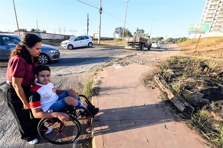 A professora universitária Michelline de Resende Angelim, de 45 anos, é mãe do Felipe, de 13 anos. O adolescente, que nasceu em Brasília, tem mielomeningocele — falha ou mau fechamento do tubo neural, que faz com que a medula, as raízes nervosas e as meninges fiquem expostas — e depende da cadeira de rodas para se locomover. Michelline destaca que faltam campanhas para educar as pessoas sobre o direito à mobilidade dos cadeirantes.