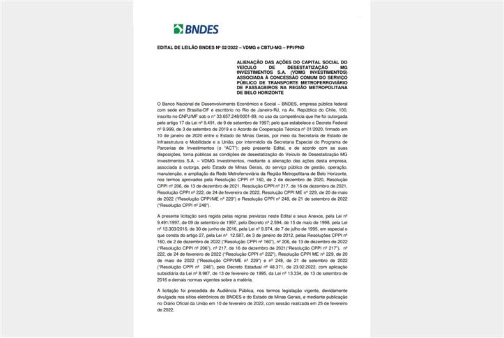 Foi publicado hoje (23) pelo O Banco Nacional de Desenvolvimento Econômico e Social (BNDES) o edital para a concessão do metrô de Belo Horizonte. O projeto engloba a gestão, operação e manutenção da rede, incluindo a Linha 1 (Novo Eldorado–Vilarinho) e a Linha 2 (Nova Suíça-Barreiro), que será construída. O leilão está previsto para o dia 22 de dezembro, na B3, em São Paulo.