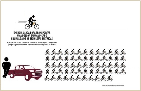 Então, a energia usada para transportar uma pessoa em uma picape equivale à de 63 bicicletas elétricas.