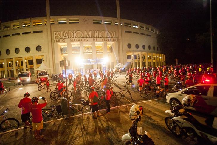 Pedalada noturna, com parada diante do estádio do Pacaembu, em SP. Foto: Ricardo Ferreira/ Sesc