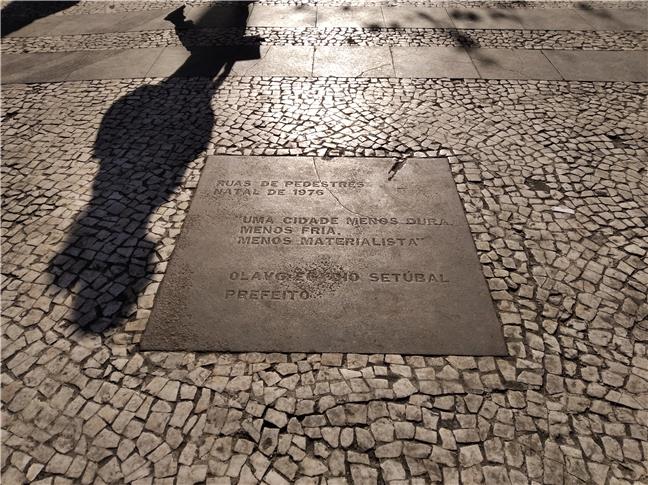 Painel de pedra marca a data inaugural do calçadão na rua Barão de Itapetininga Foto: Marcos de Sousa