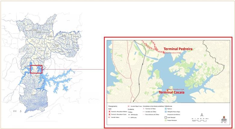Mapa mostra os dois terminais hidroviários - Pedreira e Cocaia - às margens da Billings. Imagem: Prefeitura de SP