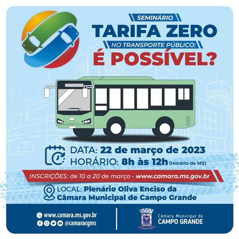A possibilidade de adoção da tarifa zero no transporte público de Campo Grande (MS) é o principal tema do seminário que será realizado na próxima quarta-feira (22) pela Câmara Municipal da capital sul-mato-grossense.
