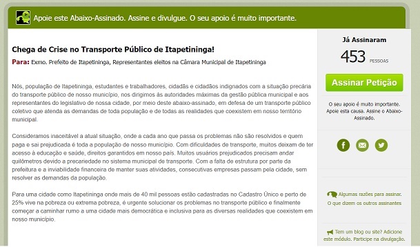 Um abaixo-assinado já circula nas redes sociais pedindo a revisão do modelo de concessão dos transportes na cidade, tendo como referência a política de "tarifa zero", já adotada por outras cidades que enfrentavam problemas semelhantes. "O movimento foi iniciado por alunos de escolas públicas, porque alguns deles simplesmente não conseguem chegar às aulas por falta de transporte. Nós apoiamos e ajudamos o grupo de estudantes a iniciar um abaixo-assinado que é dirigido à Prefeitura...", explicou Luna.