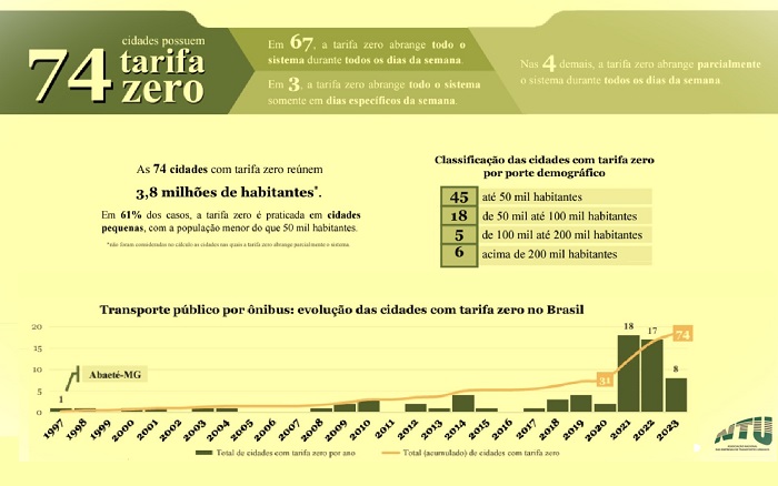 Gráfico mostra a presença da tarifa zero em 74 cidades do país Fonte: Relatório da NTU
