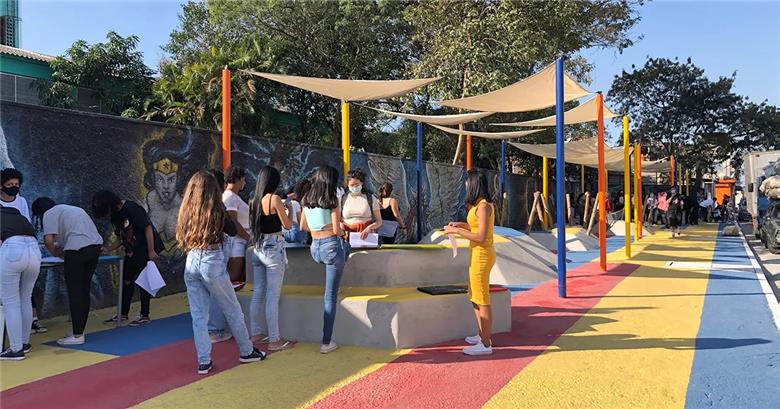 Cerca de 60 alunos da Escola Municipal Virgílio de Mello Franco, no Jardim Pantanal, na zona leste de São Paulo, puderam vivenciar essa experiência no ano passado, ao participarem do processo de cocriação e construção do espaço em frente à escola.