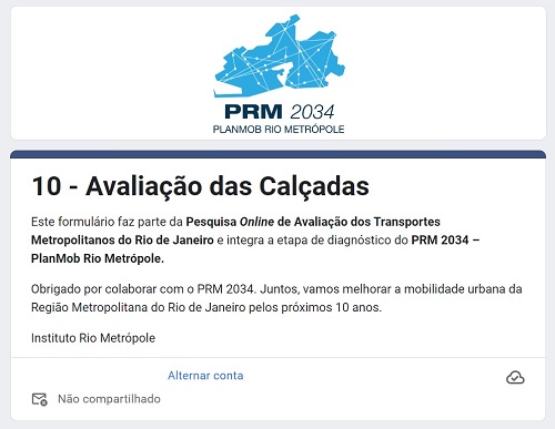 Moradores da Região Metropolitana do Rio de Janeiro podem participar da pesquisa para plano de mobilidade integrado das 22 cidades que integram a área de governança metropolitana. A pesquisa - disponível on-line para computadores e smartphones - cumpre a etapa de diagnóstico para alimentar o futuro PlanMob Rio Metrópole, que estabelecerá metas para a região até 2034.