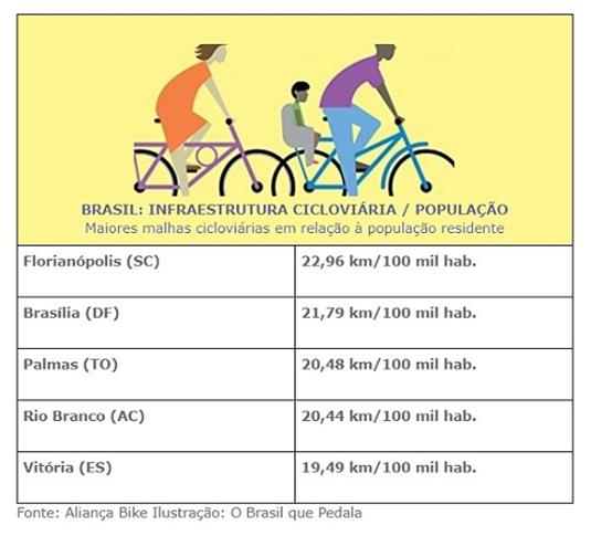 Outra abordagem do levantamento fez a comparação entre o volume de ciclovias/ciclofaixas e a população residente. Nesse caso, o principal destaque ficou com Florianópolis (SC), que tem 22,96 km a cada 100 mil habitantes. Na sequência, aparecem Brasília, com 21,79 km a cada 100 mil habitantes; e Palmas, com 20,48 km a cada 100 mil habitantes.