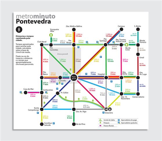 Mapa das distâncias para percorrer a pé em Pontevedra. Imagem: Prefeitura de Pontevedra